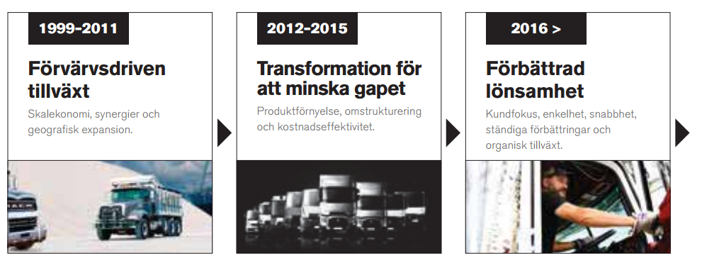 ”Efter mer än ett decennium med en aktiv förvärvsstrategi för att nå erforderlig storlek för att vara konkurrenskraftig inom kommersiella fordon, är Volvokoncernen i en fas med fokus på organisk tillväxt, ökad effektivitet, förbättrad lönsamhet och att komma närmare kunderna.”